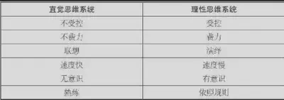 两种思维方式之间的区别,一种是直觉和自动的,另外一种是思考和理性的。在本书中,我们将第一种思维方式称为“直觉思维系统”,将第二种思维方式称为“理性思维系统”(在一些心理学文献中,这两个系统有时候被分别称为“系统1”和“系统2”)。